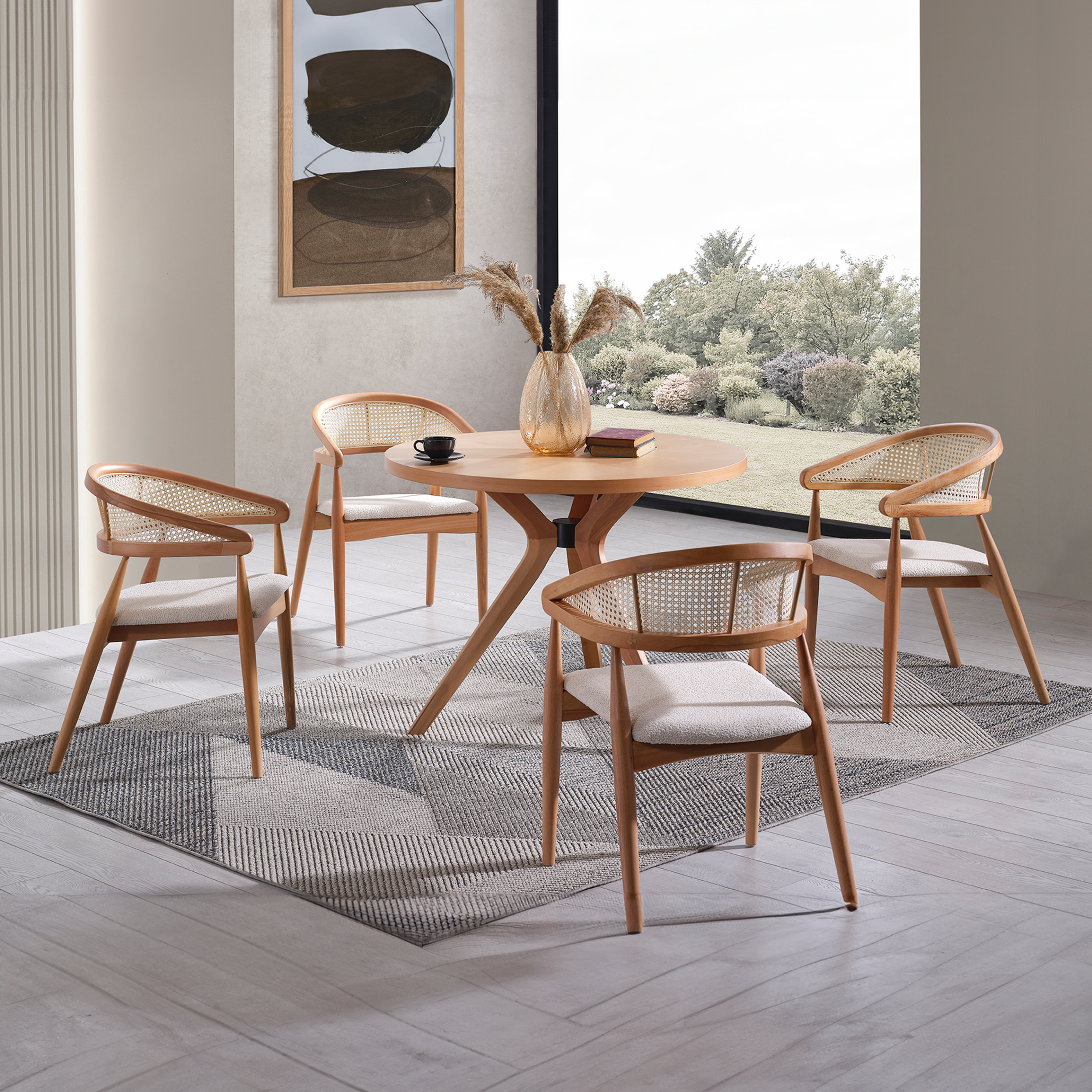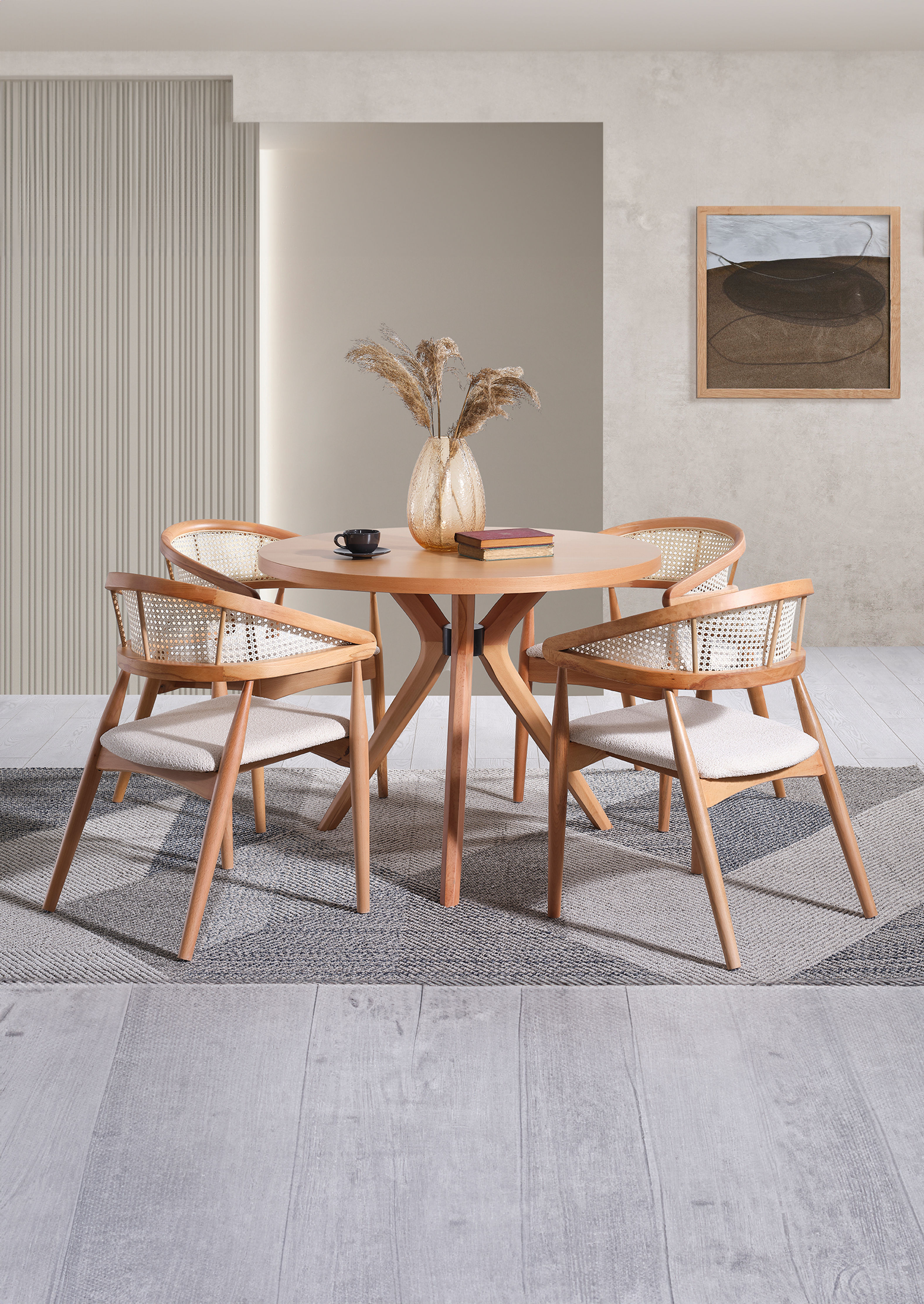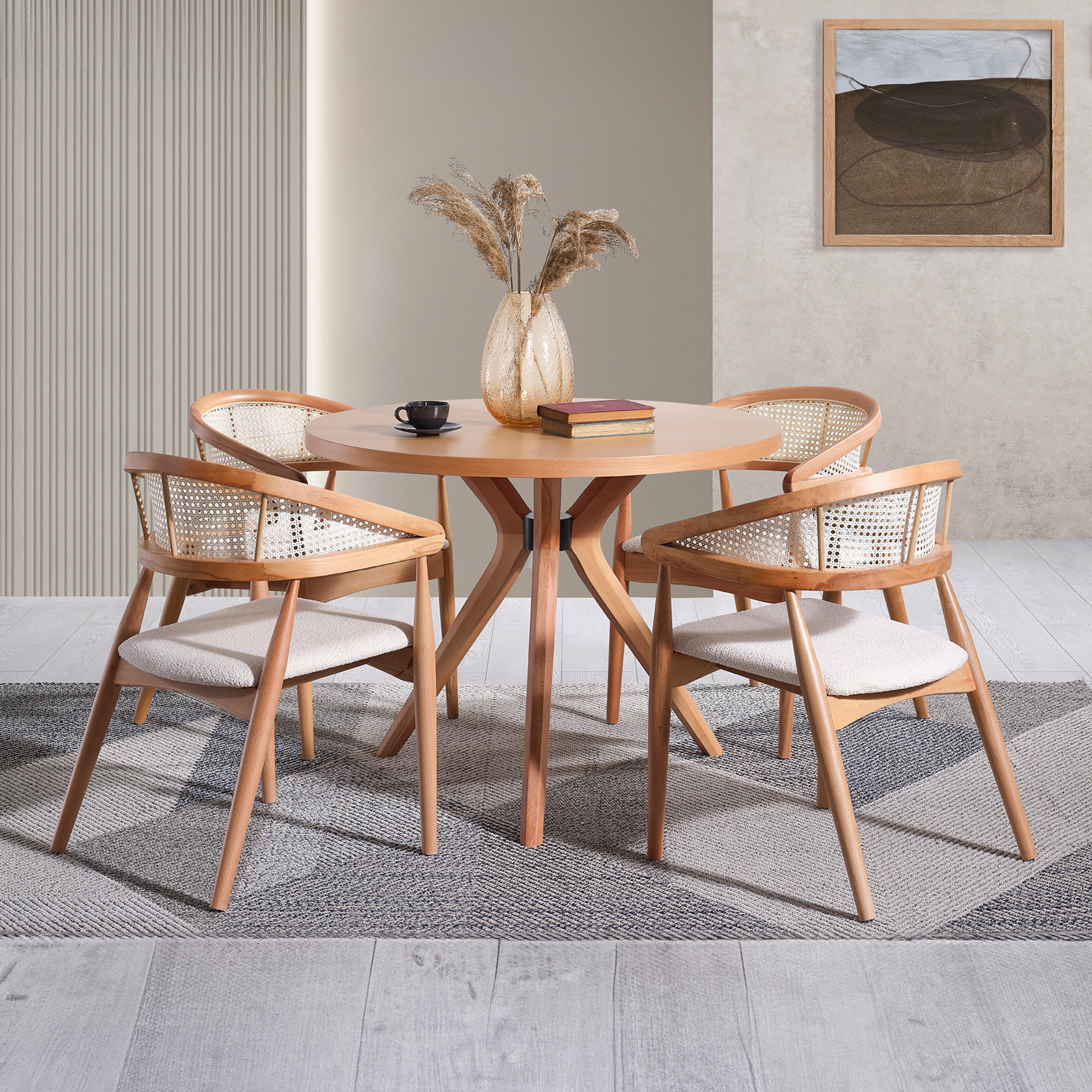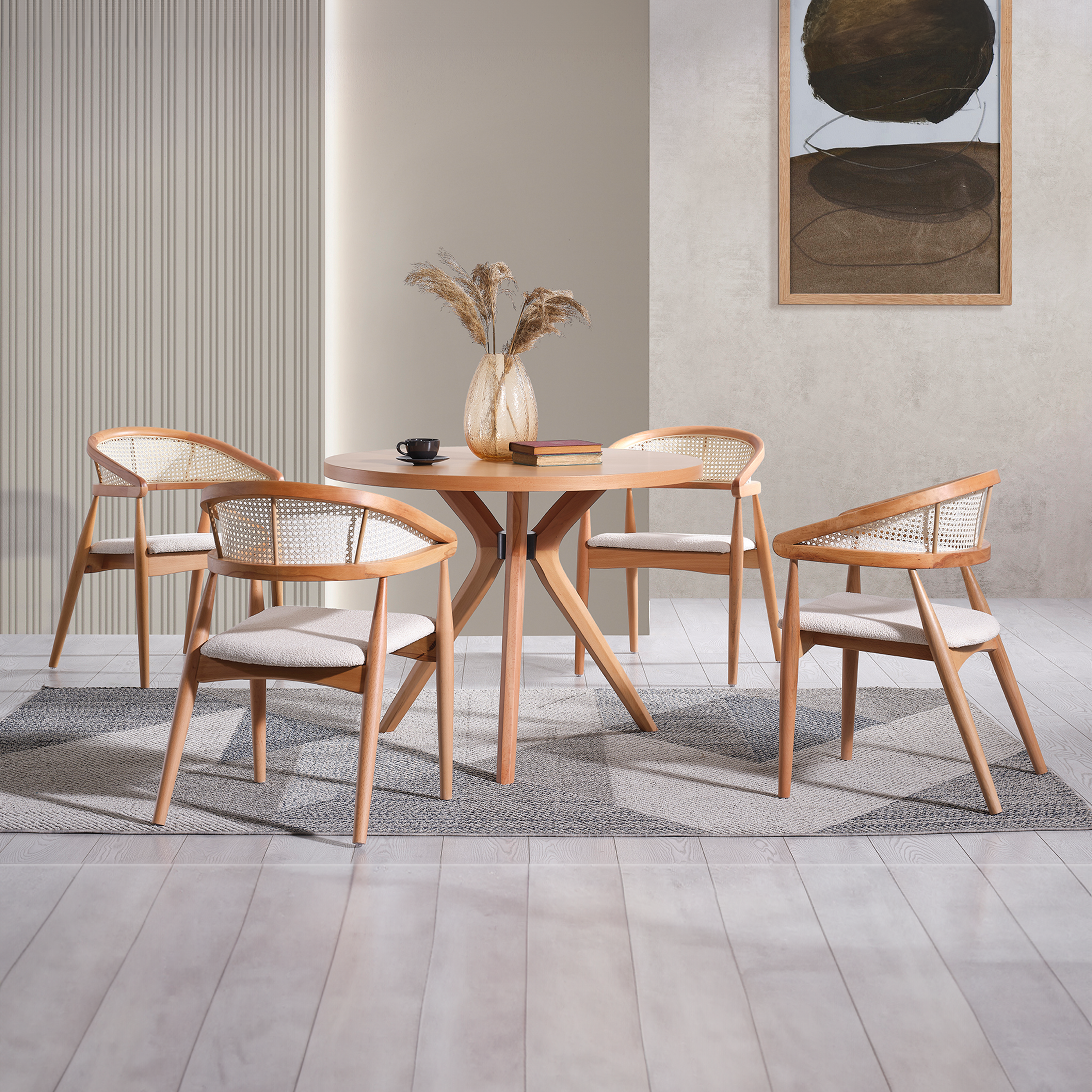 Diese atemberaubende Essgruppe besteht aus einem runden Tisch und vier stilvollen Stühlen, alle in einem wunderschönen Naturbraun gehalten, die Wärme und Eleganz in jeden Raum bringen.